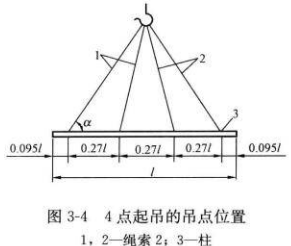 4、采用4個(gè)吊點(diǎn)時(shí),兩端的2個(gè)吊點(diǎn)距兩端的距離為0.095l,中間兩個(gè)吊點(diǎn)的距離為0.27l。如圖3-4所示。